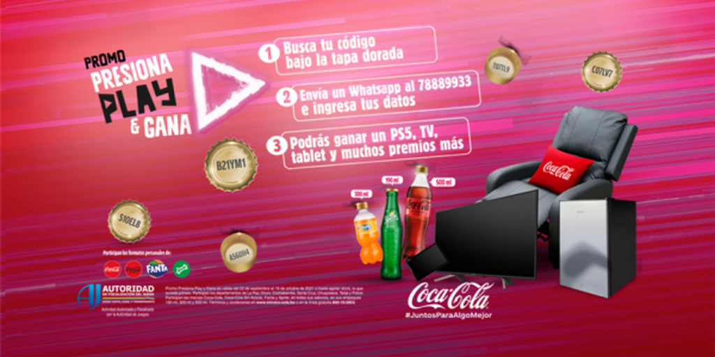 La oportunidad de ganarte un Play Station 5, un televisor, tablets, paquetes de megas, entre otros, está al alcance de una tapita. En esta oportunidad, Coca-Cola Bolivia pone a disposición de sus clientes la posibilidad de acceder a diversos y atractivos premios mientras disfrutas tu bebida favorita.