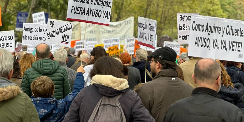 La marcha, en defensa de “una sanidad 100% pública, universal y de calidad”, fue convocada por sindicatos y diferentes colectivos sociales, contra la política sanitaria del gobierno regional de Isabel Díaz Ayuso, del Partido Popular (PP, derecha).