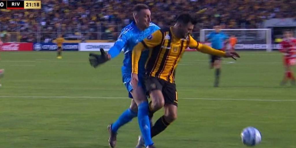 A los 20’ del primer tiempo, un pase filtrado de Michael Ortega para la carrera de Enrique Triverio terminó en un penal cometido por Armani, quien en su afán de ‘aguantar’ al delantero, pensando que la pelota se iba de la cancha, cometió una falta insólita.