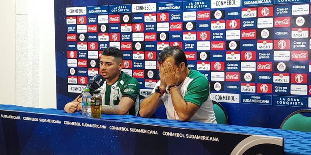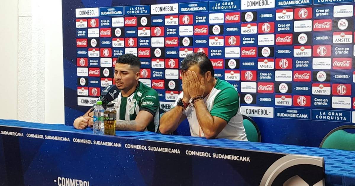 [Foto: 11-90 Red] / Erwin Sánchez (der.) se toma el rostro en la conferencia de prensa tras el partido