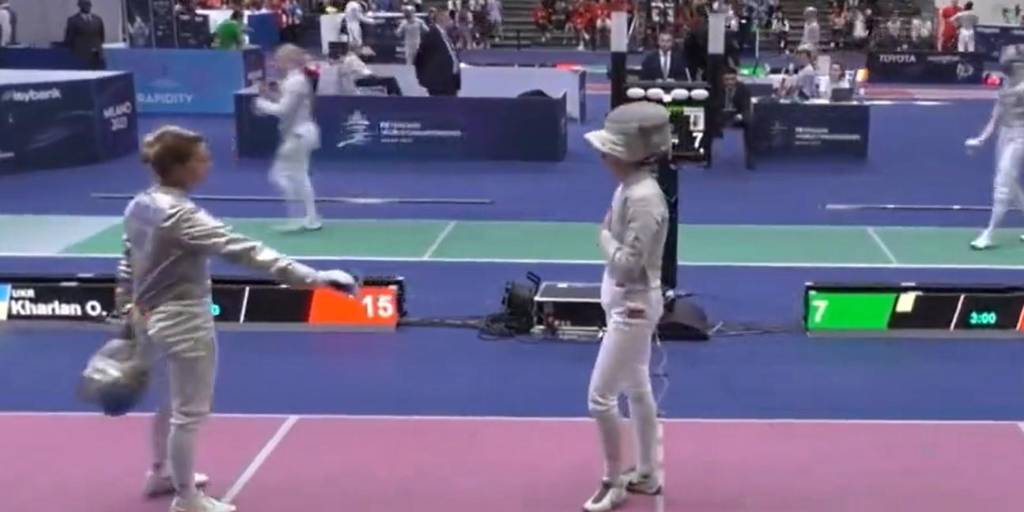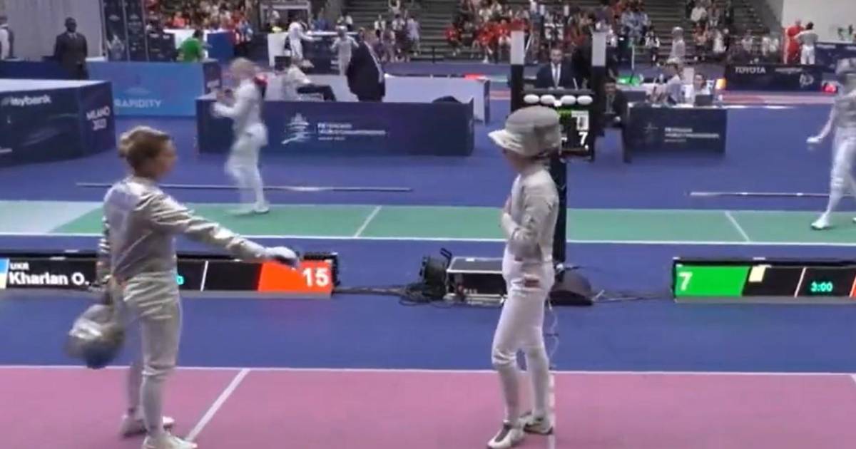 Al término del combate que enfrentó a ambas, en el que Kharlan se impuso por 15-7, su rival se dirigió a ella para estrechar su mano, gesto que la ucrania descartó y cambió por el de presentar su arma a su contrincante.