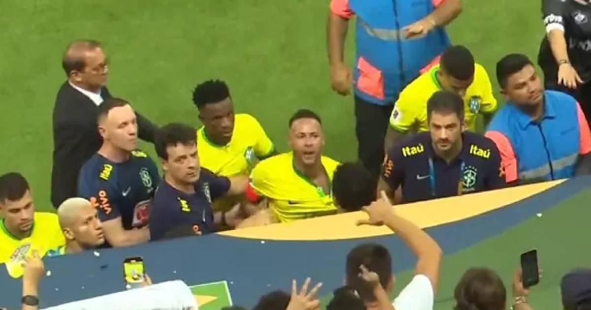 El ‘10’ de la Canarinha salía del campo de juego cuando una cajita con pipocas le dio en la cabeza. La figura explotó de ira recriminando por lo ocurrido.