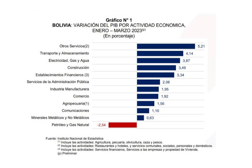 La economía boliviana creció un 2,28% entre enero y marzo de la gestión 2023, según confirmó este miércoles el ministro de Planificación Sergio Cusicanqui, al presentar el reporte del Instituto Nacional de Estadística (INE), el cual presenta cifras en rojo en lo que respecta al sector de ‘Gas y Petróleo’.