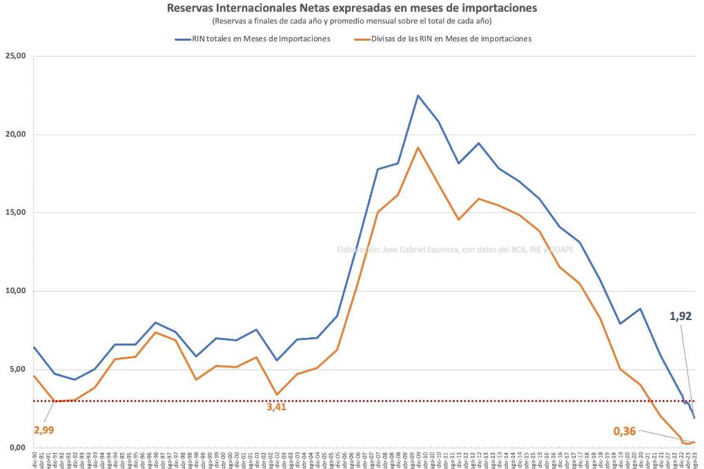Espinoza calcula, con base al último informe del BCB sobre la venta de oro, que hasta agosto, el total de las RIN estaría un poco por encima de los 2.065 millones de dólares.