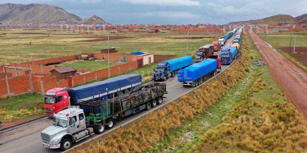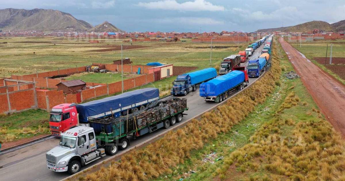 Las medidas en contra del gobierno de Dina Boluarte afecta al comercio exterior boliviano; en este viernes se constató que en la frontera se ha formado una gran cantidad de camiones que transportan soya, aceite, alcohol y demás productos bolivianos que no pueden seguir su camino.