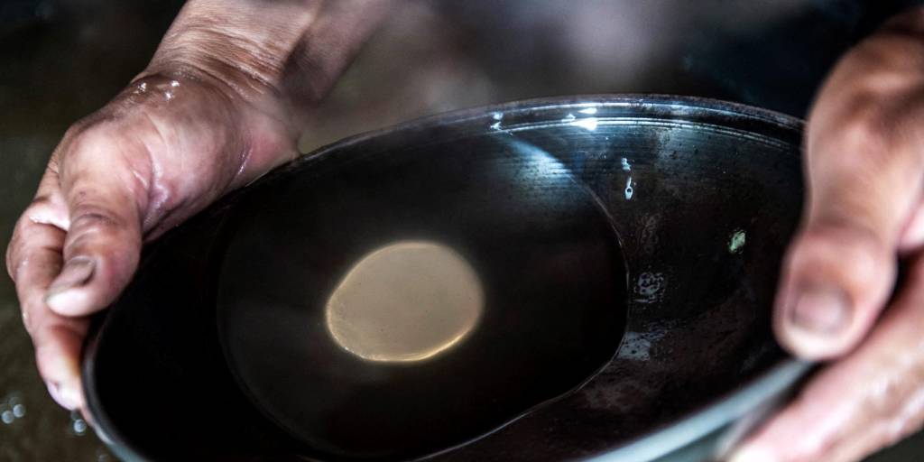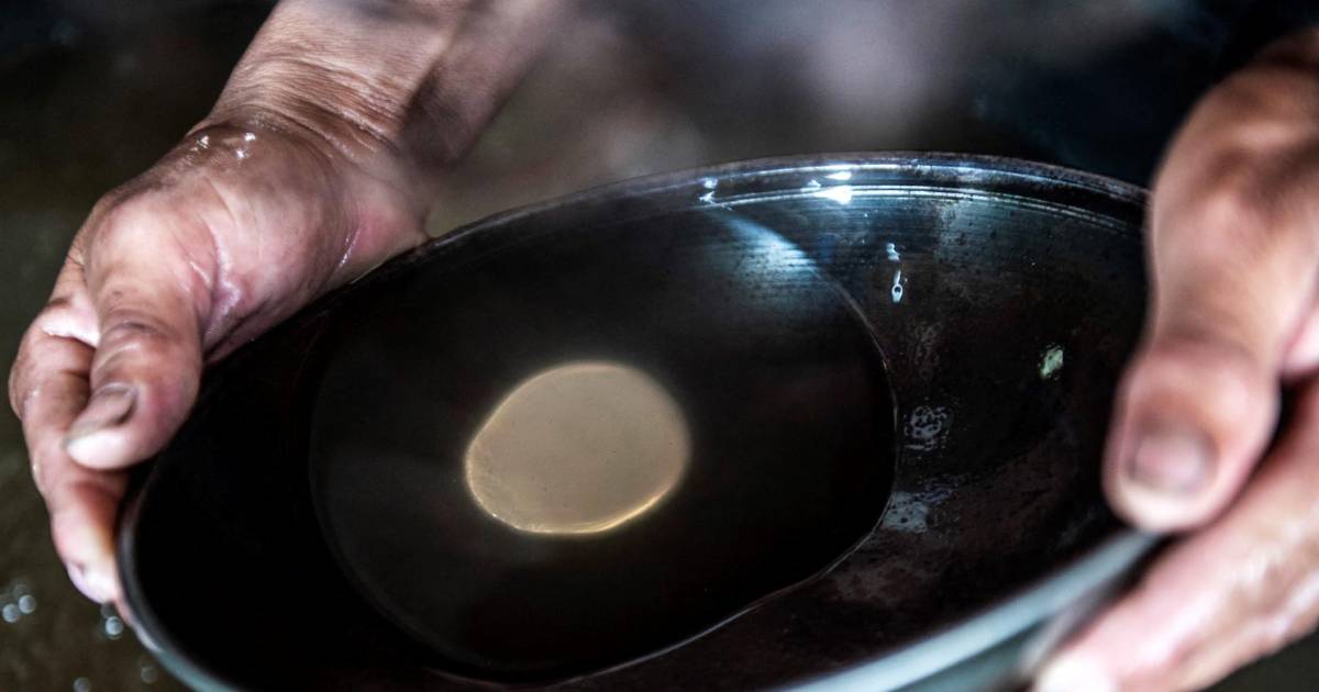 [Foto: AFP] / Un minero muestra oro extraído en el río Madre de Dios, en el territorio indígena Tacana