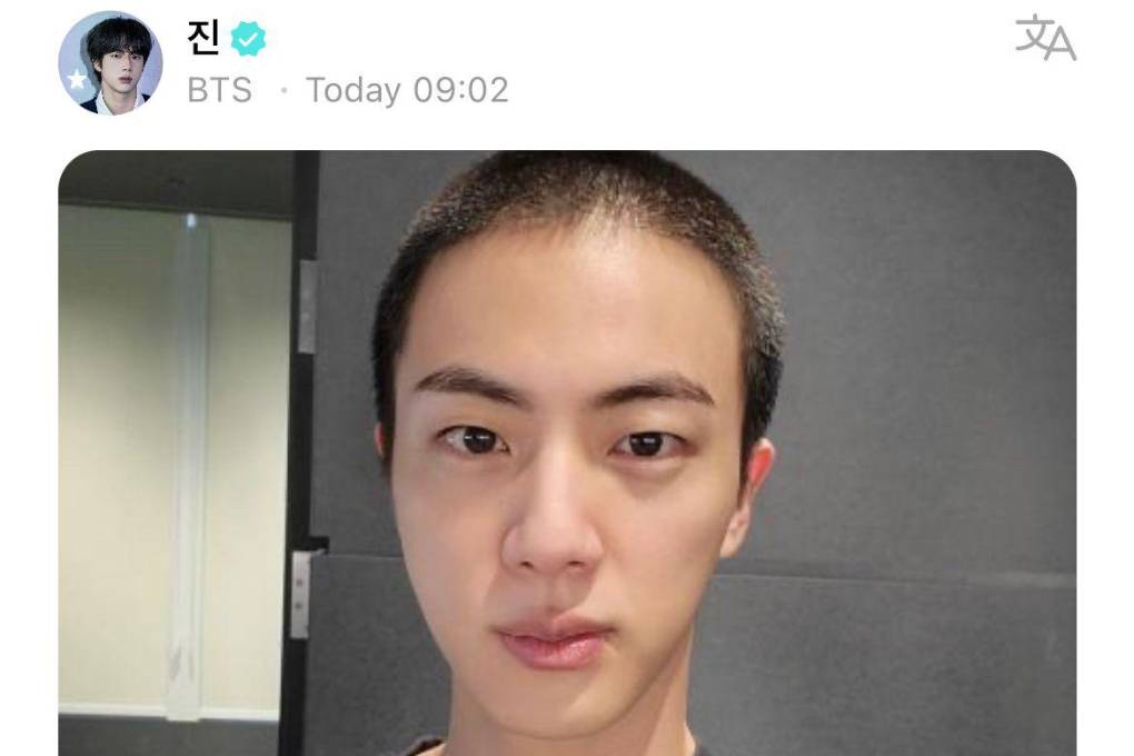 El miembro de la reconocida banda de K-pop BTS, publicó una imagen de su nueva apariencia en la que luce su cabellera rapada para poder prestar su servicio al Ejército de su país.