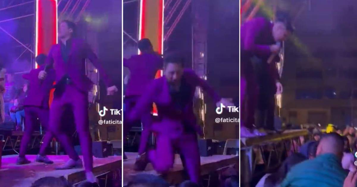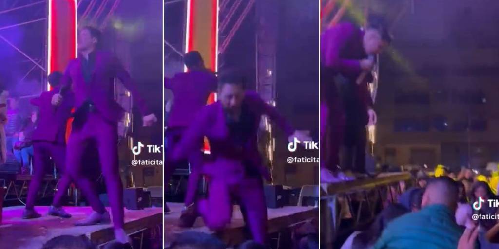 En los videos, que se hicieron rápidamente virales en TikTok, se puede ver al músico bailando y saltando cuando da un giro al límite de la tarima sin calcular bien, cae con una rodilla y su otro pie pisa hacia el vacío, cayendo de forma estrepitosa.