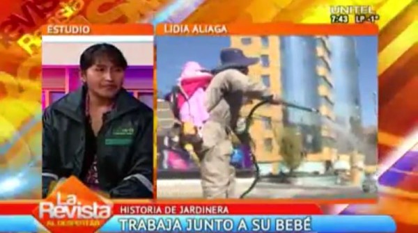 La foto de esta mujer se difundió por redes sociales. En ella se ve a Lidia mientras hace trabajos de jardinería con su pequeña de año y medio en la espalda en la zona sur paceña. Consultada sobre su oficio, Lidia asegura que es su vocación y que hace con gusto la poda, limpieza y regado de jardines. Esta mujer trabajadora de manera paralela cuida a su hija quien la acompañará durante algunos días mientras haya receso en la guardería. El esposo de Lidia es chófer de volqueta y se hace cargo de su otra niña de cuatro años.