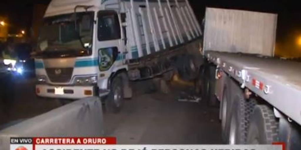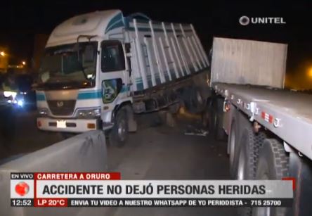 En la carretera a Oruro, dos camiones protagonizaron un accidente de tránsito. La Policía presume que uno de los conductores venía con exceso de velocidad y la imprudencia hizo que cometan un accidente que no dejó heridos.