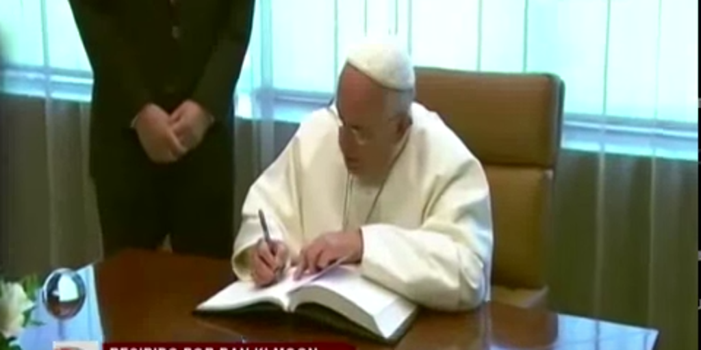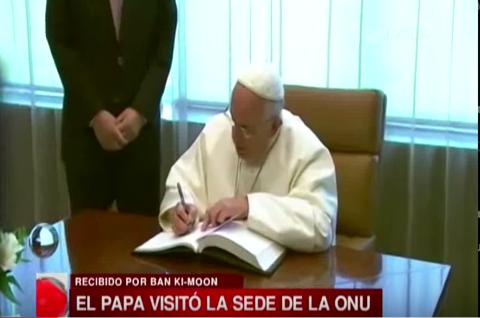 El papa Francisco visitó la sede de la ONU en New York, donde fue recibido por el Secretario General, Ban Ki-Moon, su esposa, niños y los funcionarios de la organización.