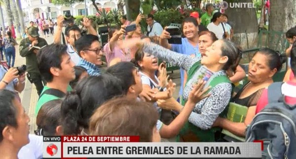 El traslado a un nuevo mercado el próximo 30 de abril ha dividido a los comerciantes de La Ramada, dos grupos protagonizaron esta mañana un enfrentamiento a golpes en la plaza 24 de septiembre, un grupo de comerciantes liderados por Jaime Flores estaba brindando una conferencia de prensa cuando un segundo grupo de gremiales, encabezados por el dirigente Daniel Suárez, interrumpió el encuentro, lo que derivó en el enfrentamiento.