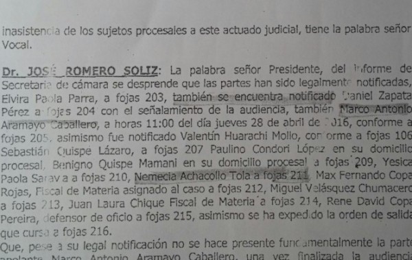 El acta agrega el siguiente detalle: “se notifica también a otros sujetos procesales, en su condición de imputados así como víctimas y la representación del Ministerio Público, en estrado de este despacho y no así con relación a la representación del Ministerio Público, que han sido notificados conforme a ley, empero, no comparece a este actuado judicial, menos el Ministerio de Transparencia, lo que extraña su ausencia a este actuado judicial, siendo autoridades responsables de dichas instituciones que deben colaborar, con la pronta resolución del recurso de apelación planteada por el imputado, sin embargo brillan con su ausencia estas autoridades”.
