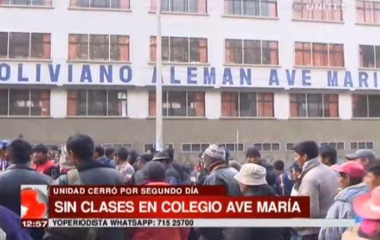 El colegio Ave María en la ciudad de La Paz, cerró sus puertas debido a que los cocaleros de los Yungas continúan en vigilia y los enfrentamientos pueden causar daños a sus estudiantes. En días pasados entró gas lacrimógeno a las aulas por lo que hubo varios escolares afectados.