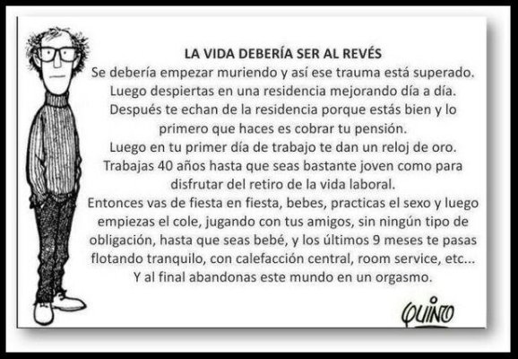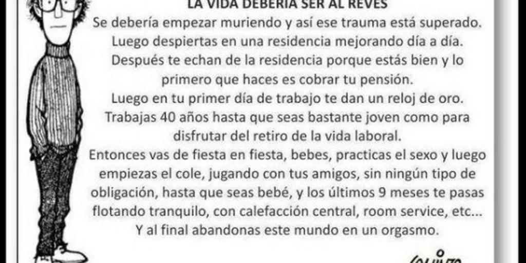 Compartido también como meme, el breve escrito se ha viralizado con el título “La vida debería ser al revés” y también “La vida según Quino”, pues ha sido atribuido al célebre humorista gráfico argentino, creador de la tira Mafalda, quien falleció en su provincia natal de Mendoza en la mañana del 30 de septiembre.