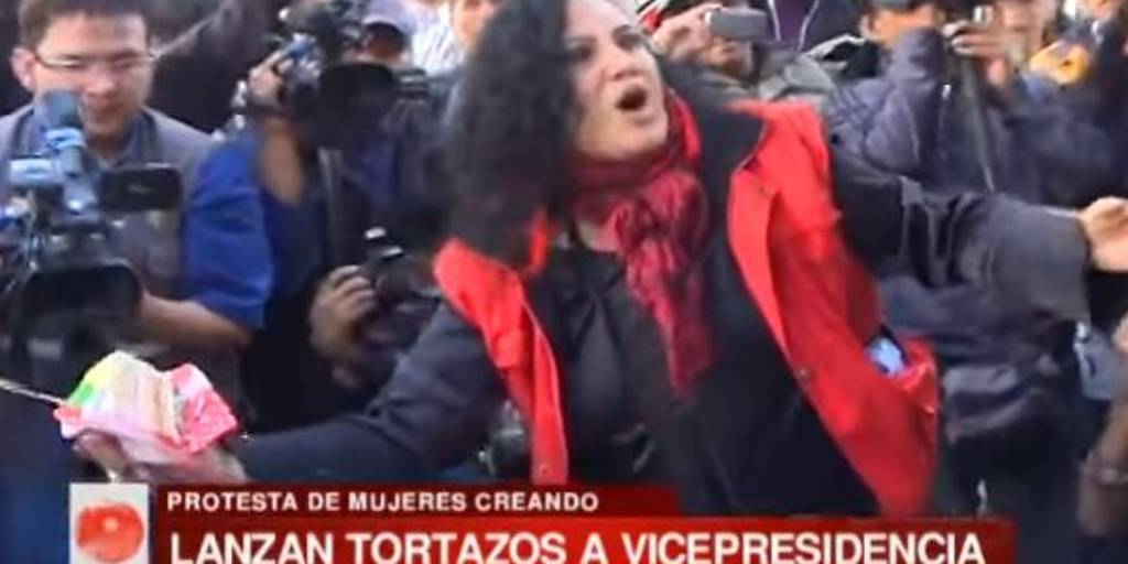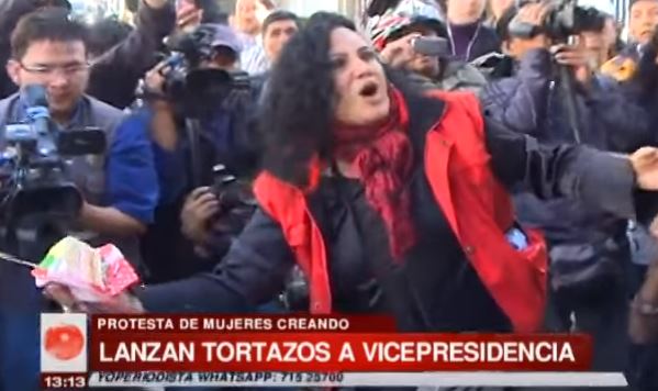 Encabezados por María Galindo activistas de ‘Mujeres Creando’ en compañía de las personas con discapacidad decidieron lanzar ‘tortazos’ en la puertas de la Vicepresidencia en reproche a los gastos que se realizan “innecesariamente” una pequeña tajada quedo para los discapacitados que representaba su bono.