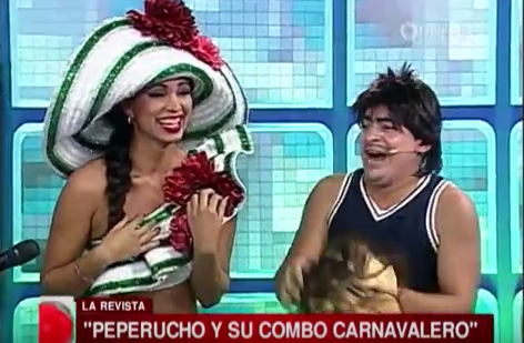 'Peperucho' intentó vender su combo carnavalero y a su paso no sólo arrancó risas sino también hasta gritos. Mira el susto que este gracioso personaje le dio a esta bella modelo.