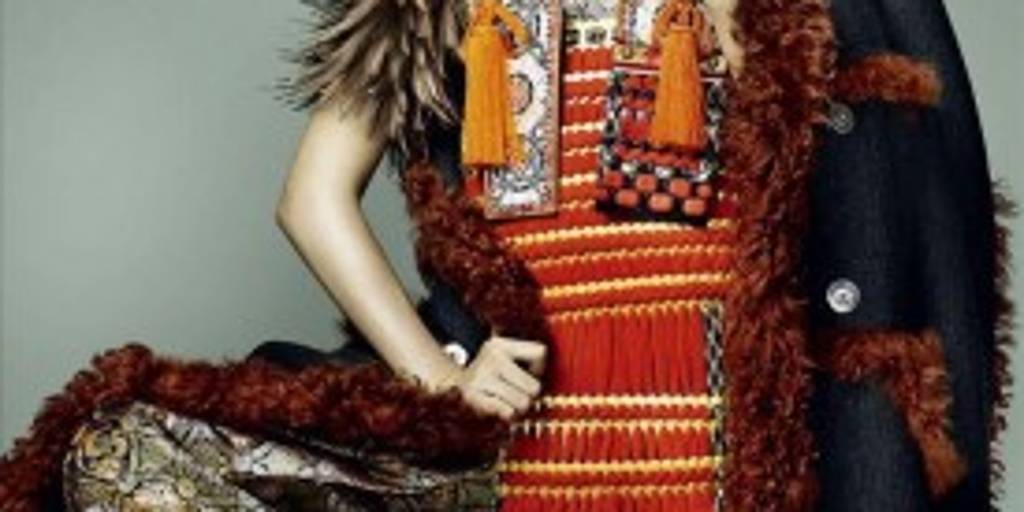 Ataviada con unos mocasines de estilo japonés y unos ropajes cargados de estampados tribales y materiales con relieve, la modelo remata un estilismo inspirado en los guerreros del país del sol naciente con un copete similar al que llevaban los samuráis.