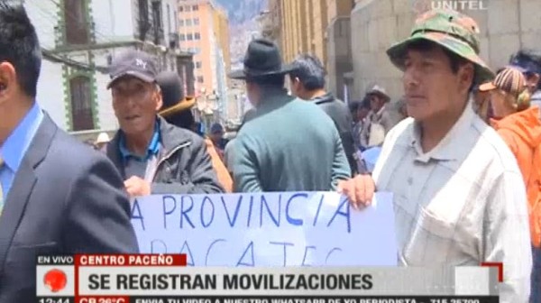 Pobladores de varios comunidades de la provincia Pacajes llegaron hasta la calle Colón y Comercio donde exigen al gobernador Felix Patzi la construcción de una vía asfaltada hasta sus comunidades, afirman que esto es una promesa de hace varios años lo cual el gobernador paceño habría incumplido, no descartan tomar otras medidas.
