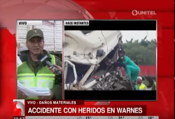 En la altura de la zona franca de la carretera a Warnes se produce este hecho de tránsito donde un camión tráiler choca frontalmente contra un camión de la empresa PIL del cual salieron heridos los conductores y ayudantes y se registran daños materiales.