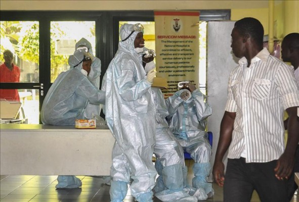El ébola, que se transmite por contacto directo con la sangre y fluidos corporales de personas o animales infectados, causa hemorragias graves y puede tener una tasa de mortalidad del 90 %.