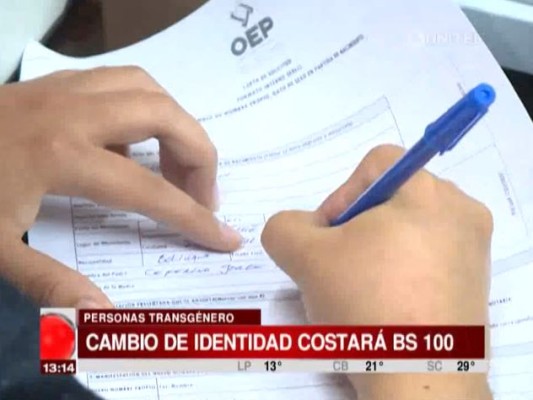 Desde hoy día las personas transexuales y transgénero podrán podrán presentar sus documentos para iniciar el trámite del cambio de identidad. Una vez presentado los registros se deben esperar 15 días para emitir una resolución, con los requisitos del certificado de antecedentes penales, certificado de nacimiento, una fotografía actualizada, de estado civil: soltera/o o divorciada/o y ser mayor de edad. El costo de esta es de cinco pagos de 20 bolivianos en total 100.