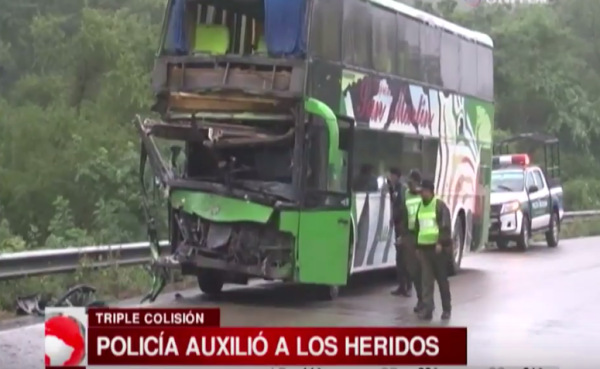 Un camión y dos buses interdepartamentales chocaron esta madrugada a la altura del kilómetro 155 de la carretera a Camiri, uno de los buses acabó volcado a un lado de la vía debido a la violencia del impacto, los heridos fueron rápidamente evacuados al centro médico más cercano, seis de ellos, con heridas de mayor gravedad, fueron derivados a la ciudad de Santa Cruz.