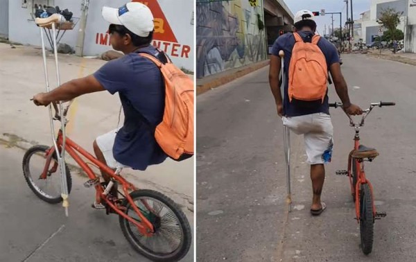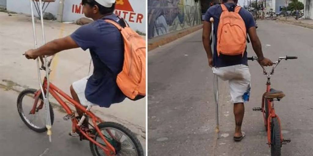 Luis Ángel, de 25 años, conocido por sus amigos como Luchín, fue grabado por un influencer cruceño transportándose en una bicicleta hacia su fuente laboral en una empresa de seguridad. El joven pedalea en la bici haciendo fuerza con una sola pierna, mientras va agarrando su muleta en una de sus manos. La bici se la prestó de su tío.