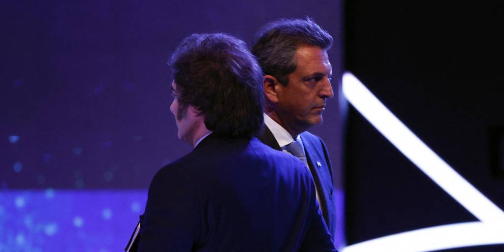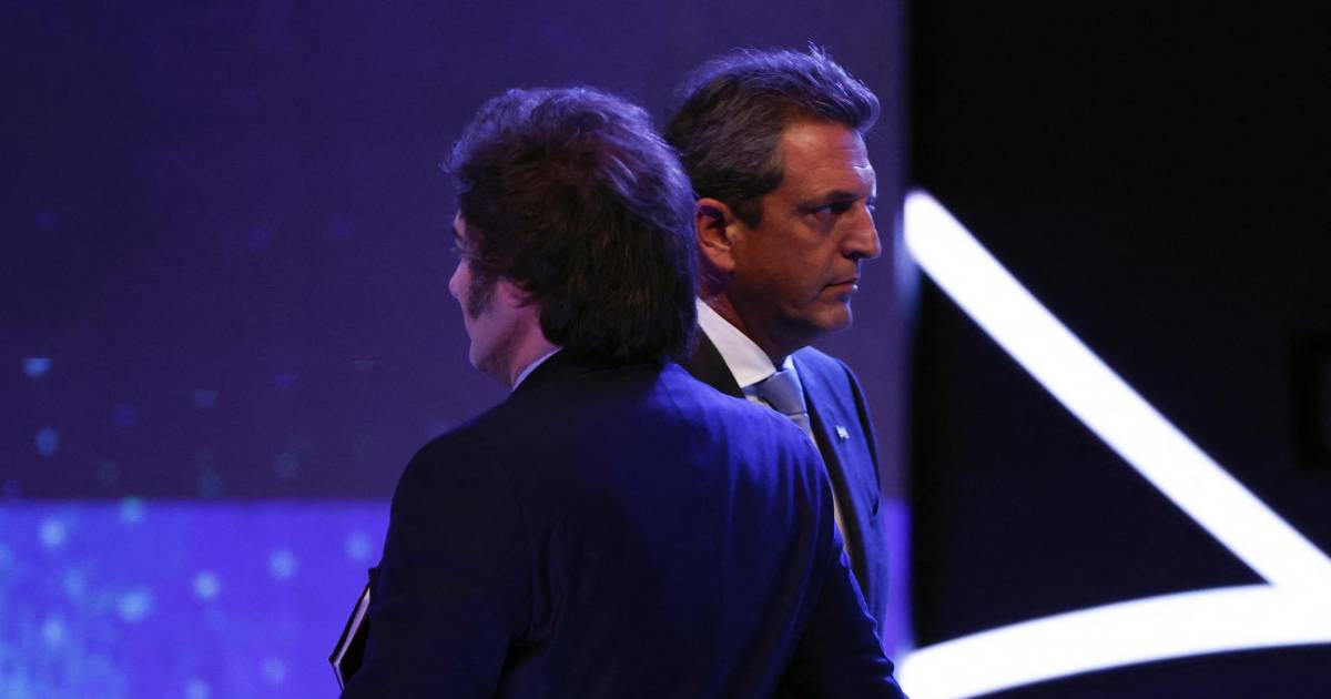 [TOMAS CUESTA / AFP] / Sergio Massa (derecha) y Javier Milei (de espaldas, a la izquierda)