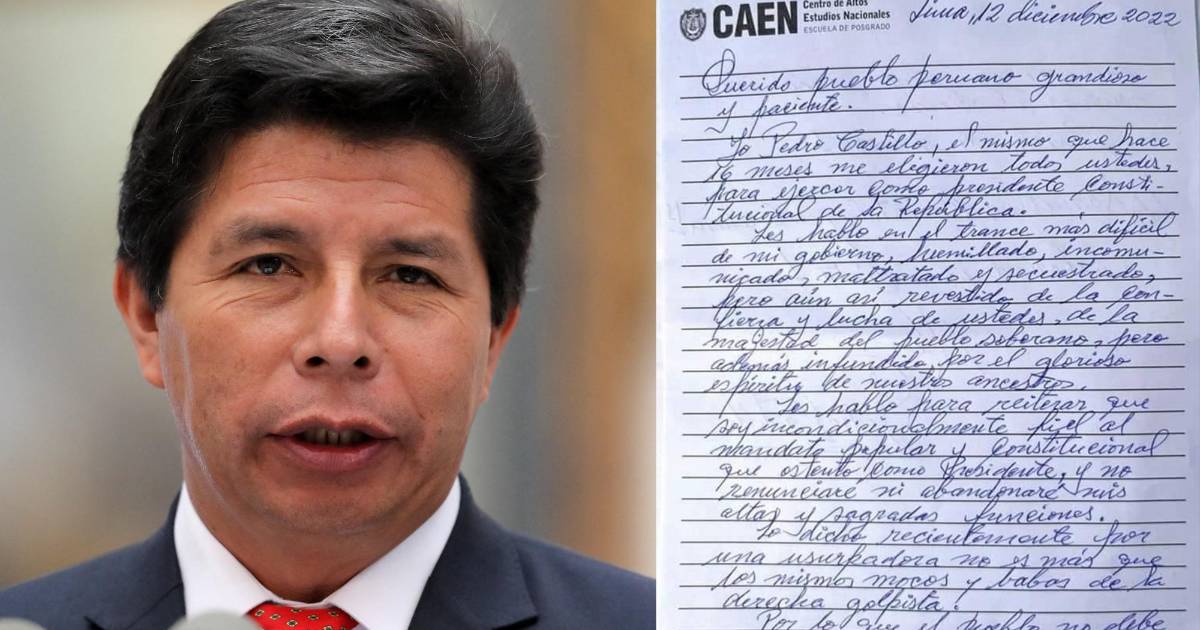 El expresidente peruano Pedro Castillo, acusado de los presuntos delitos de rebelión, conspiración y otros, publicó una carta desde su centro de arresto