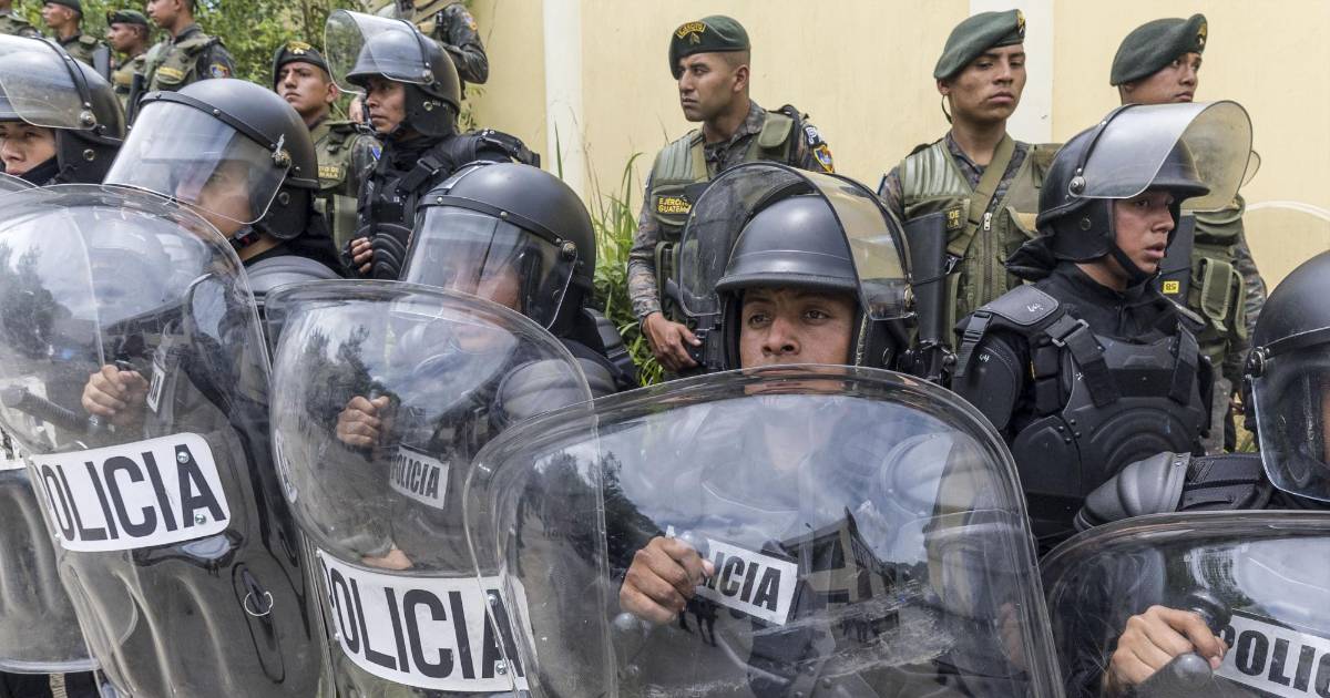 [Foto: EFE] / Policías y soldados acordonan este domingo el centro de votación de San José del Golfo, en donde fiscales y pobladores querían evitar las votaciones pues acusan al actual alcalde de acarrear personas