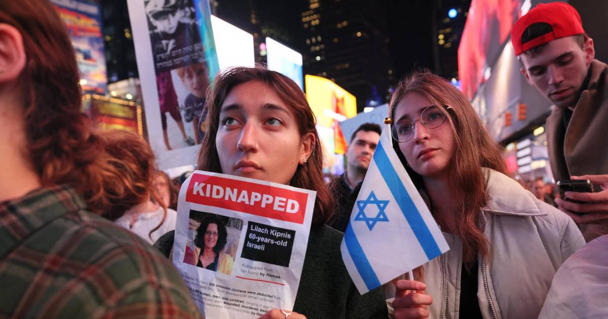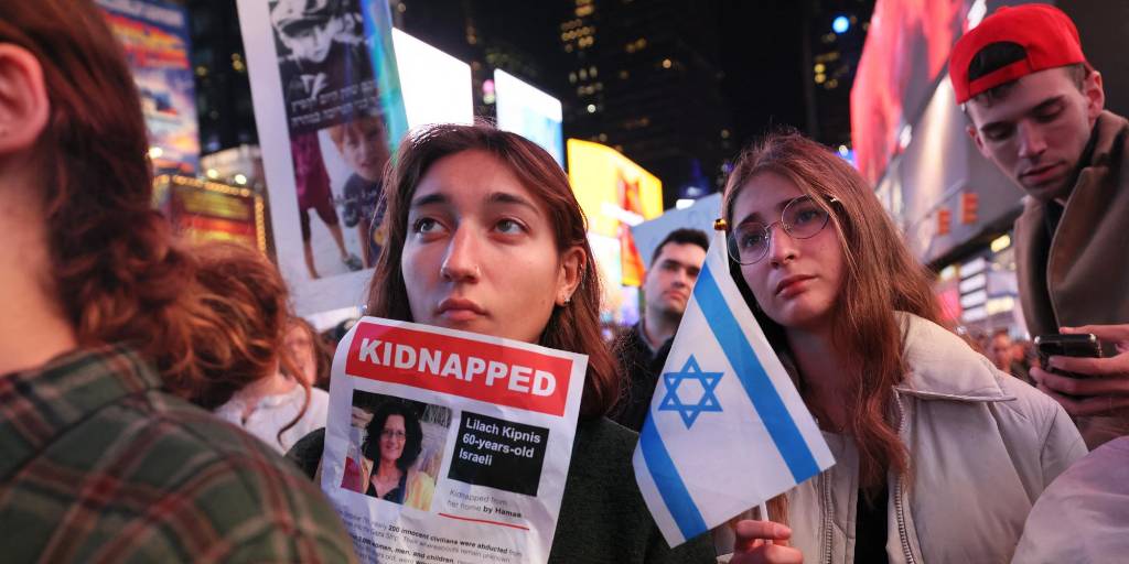 [MICHAEL M. SANTIAGO / Getty Images via AFP] / Activistas en Nueva York pidiendo por la liberación de los rehenes que están en poder de Hamás