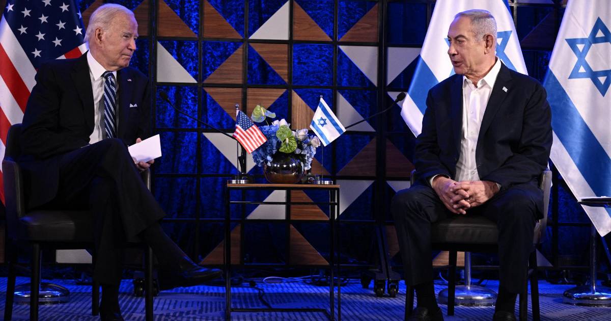 [Foto: AFP] / El presidente estadounidense Joe Biden (izq.) y el primer ministro de Israel, Benjamin Netanyahu, hablan antes de sus declaraciones y reunión en Tel Aviv