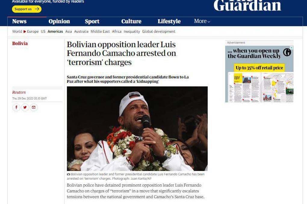 El medio inglés The Guardian también se hizo eco de la noticia, en su portada publica: “Líder opositor boliviano Luis Fernando Camacho arrestado por cargos de ‘terrorismo’”.