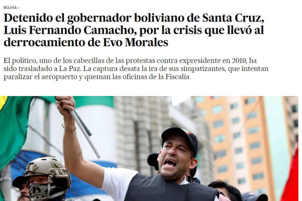 El diario El País de España tituló: “Detenido el gobernador boliviano de Santa Cruz, Luis Fernando Camacho, por la crisis que llevó al derrocamiento de Evo Morales”, mientras que CNN publicó en su portal: “Gobernador de Santa Cruz, en Bolivia, fue detenido por el caso “Golpe de Estado I”, dice la Fiscalía”.
