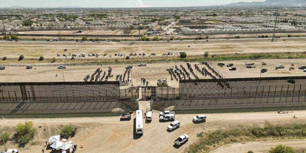 [Jonathan Fernandez / EFE] / Fotografía aérea muestra a cientos de migrantes mientras esperan este jueves junto al muro fronterizo en El Paso, Texas (EEUU).