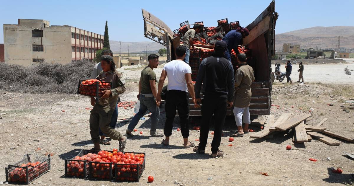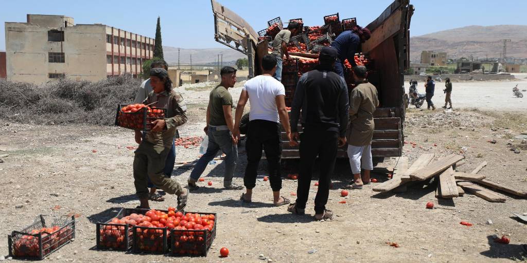 [YAHYA NEMAH / EFE] / Personas recogen tomates de un camión averiado en un mercado de verduras tras un ataque aéreo denunciado en Idlib, Siria.