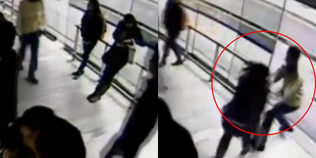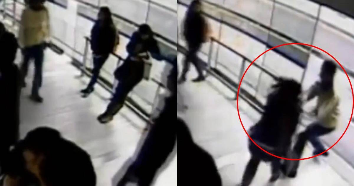 Una cámara de seguridad captó el momento exacto en el que un antisocial le roba las pertenencias a una mujer de manera brusca ante la presencia de varias personas. El hecho se registró en la parada de TransMilenio, en Bogotá, Colombia.