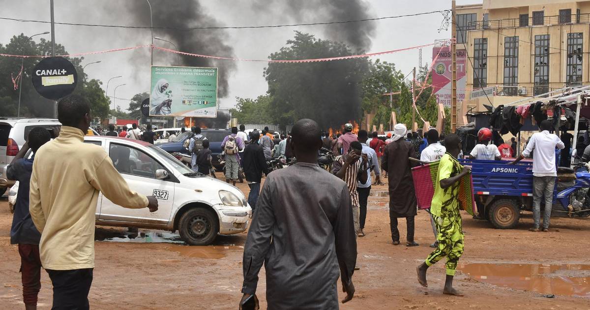 [Foto: AFP] / Una vista general de una nube de humo mientras los partidarios de las fuerzas de defensa y seguridad de Níger atacan la sede del Partido de la Democracia y el Socialismo de Níger (PNDS)