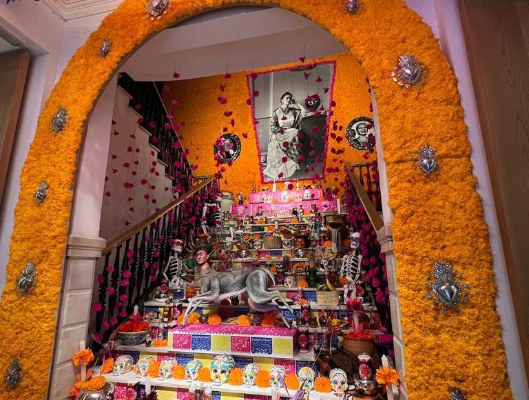 Con más de 20.000 flores de cempasúchil de papel, una icónica calavera de 13 metros de altura y múltiples piezas de arte popular mexicano, la Fundación Casa de México en España ofrece estos días a los madrileños la posibilidad de visitar su mega altar de Día de Muertos, que en su quinta edición está dedicado a la artista Frida Kahlo.