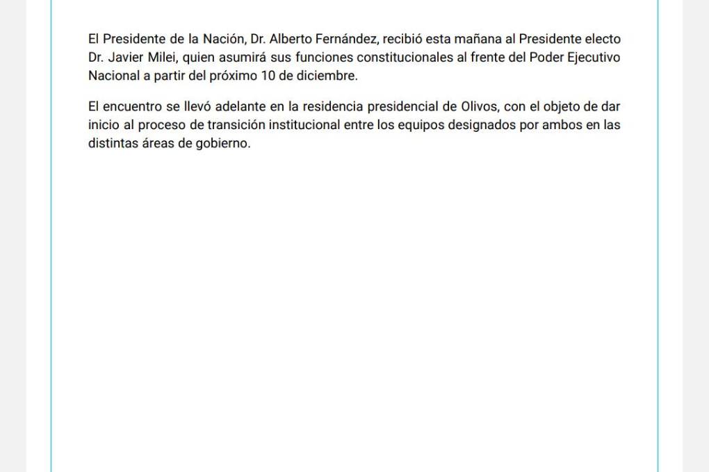 ”El encuentro se llevó adelante en la residencia presidencial de Olivos con el objeto de dar inicio al proceso de transición institucional entre los equipos designados por ambos en las distintas áreas de gobierno”, informó el comunicado difundido por la Presidencia de Argentina.