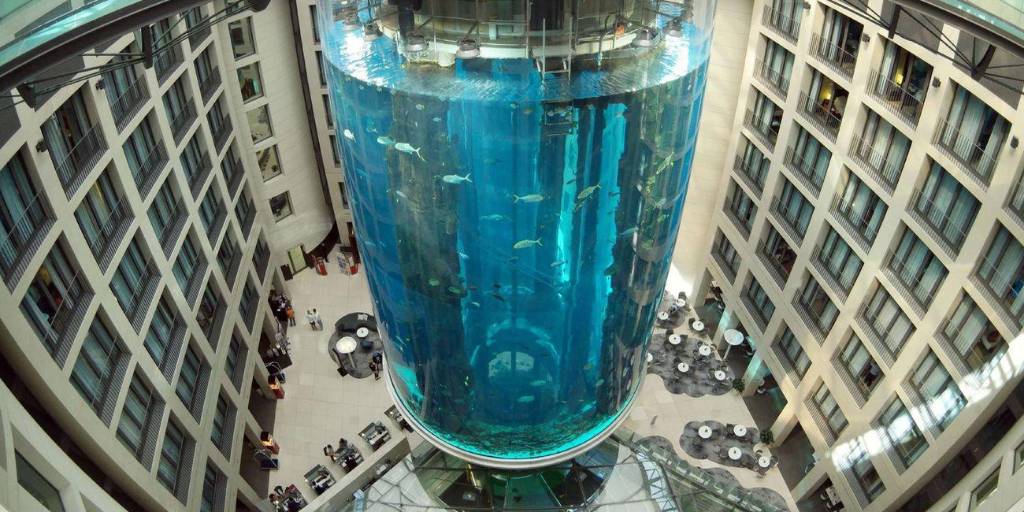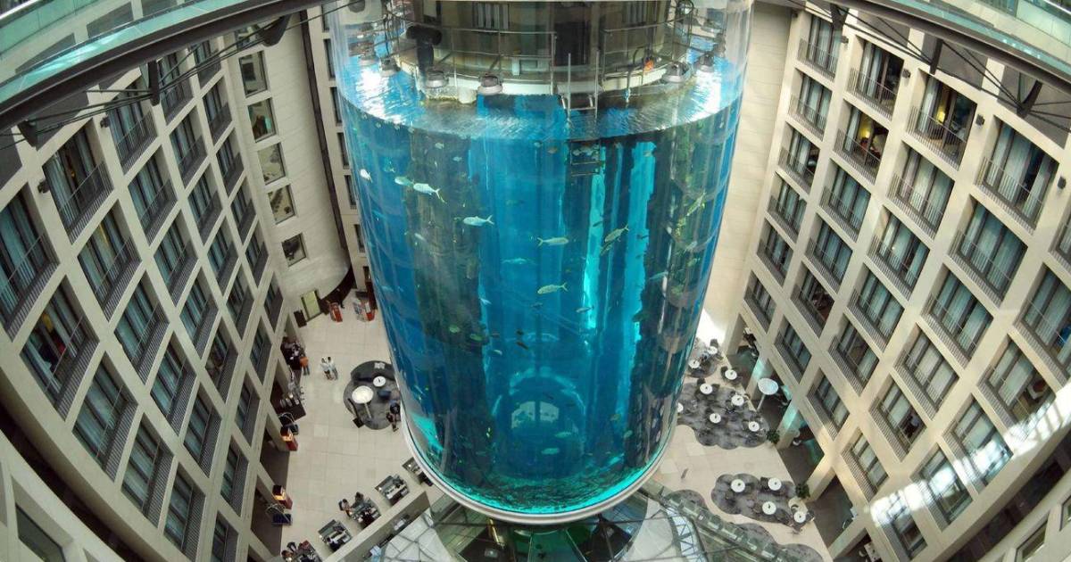 Revienta en Alemania el mayor acuario cilíndrico del mundo, ubicado en un hotel en Berlín