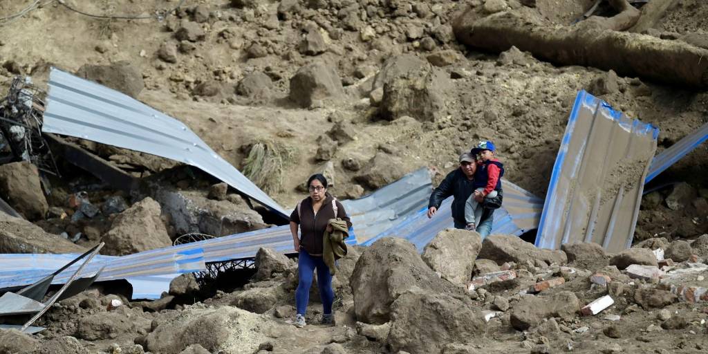 [MARCOS PIN / AFP] / Los residentes abandonan sus hogares después del deslizamiento de tierra en Alausi, Ecuador, el 28 de marzo.