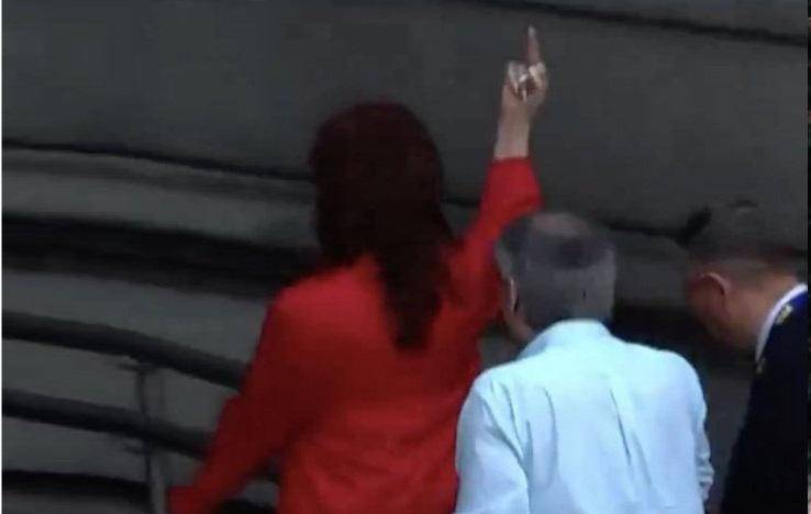 Vestida de rojo, la vicepresidenta, saludaba a los presentes cuando de repente escuchó que alguien le gritó algo que no le gustó y sin darse vuelta le respondió con ese gesto, según reseña el Clarín.