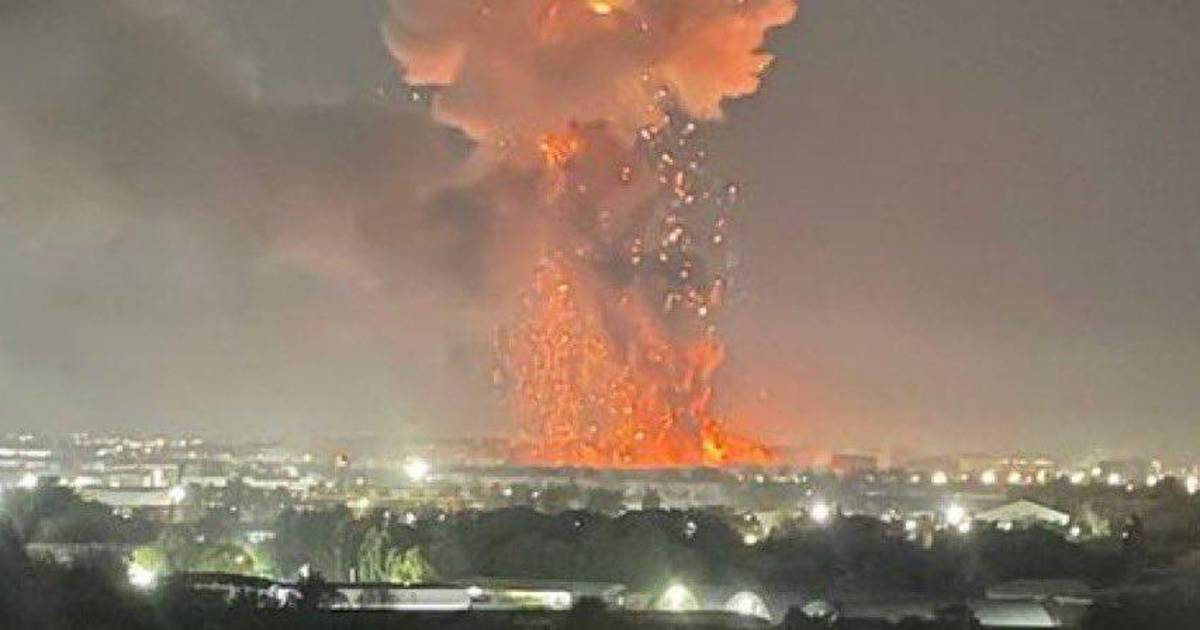 Videos difundidos en redes sociales muestran una gran columna de humo y llamas que se elevan hacia el cielo nocturno.