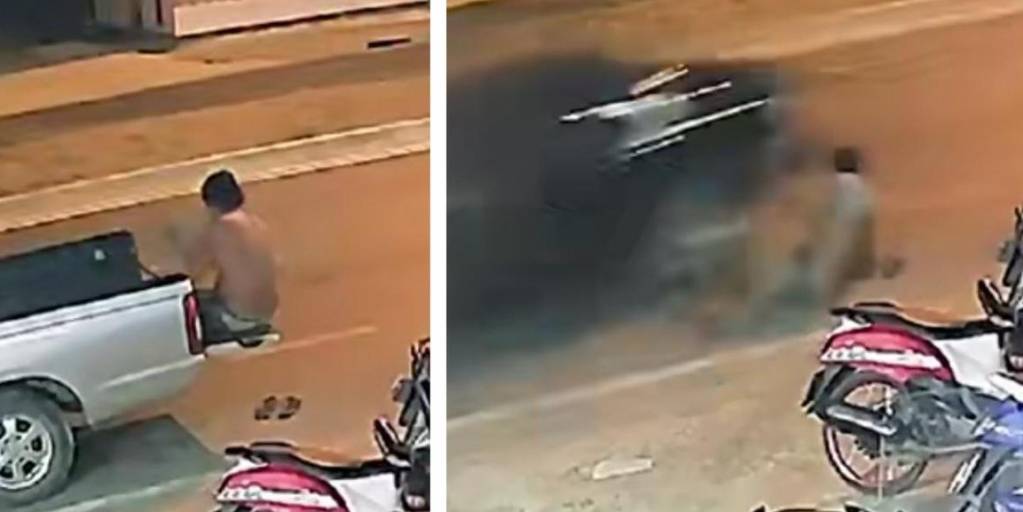En el video de las cámaras de seguridad de la zona se observa que el sujeto está sentado distraído en la carrocería de una camioneta que está estacionada a un costado de la avenida.