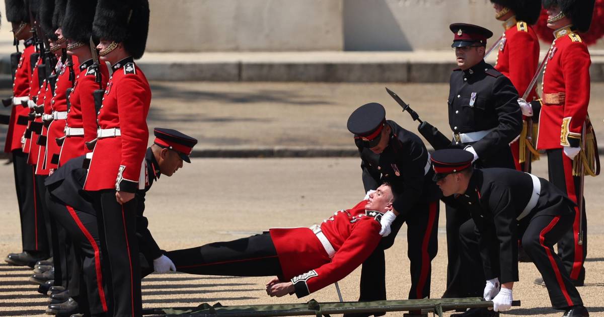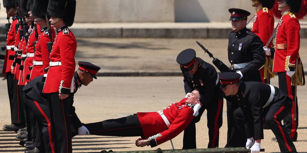 La ola de calor en Reino Unido ocasionó que al menos tres guardias reales se desmayaran durante el desfile militar conocido como Colone’s Review, donde este sábado participaron más de 1.400 soldados de la División Doméstica y la Royal Horse Artillery Troop.