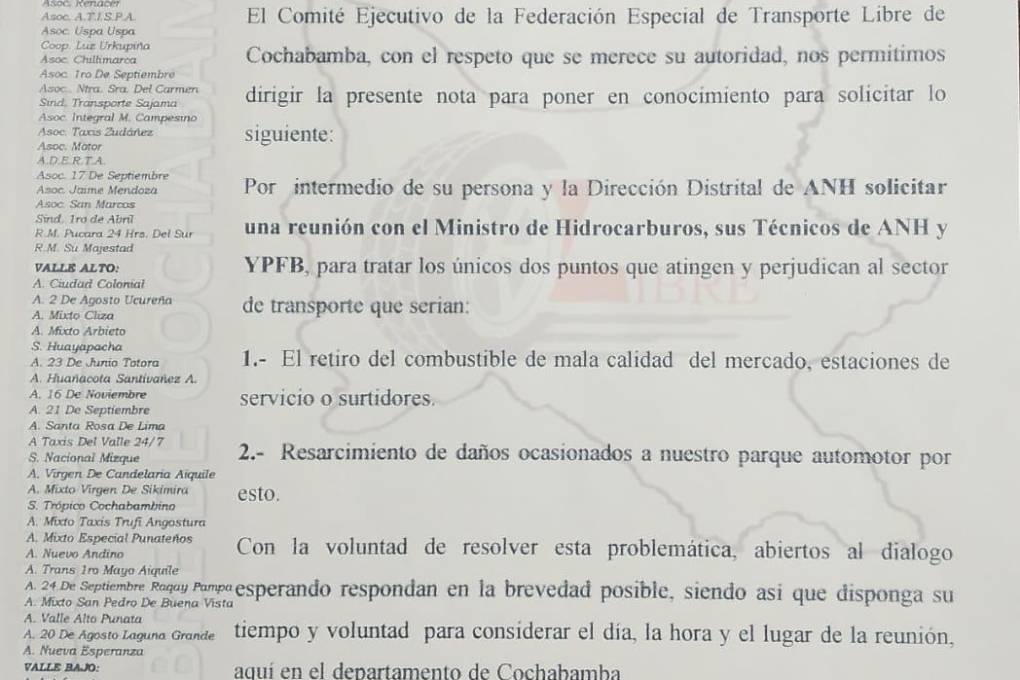 “Por intermedio de su persona y la dirección distrital de YPFB solicitar una reunión con el ministro de Hidrocarburos, sus técnicos de YPFB y ANH para tratar los únicos puntos que atingen y perjudican al sector del transporte”, expresa el documento.