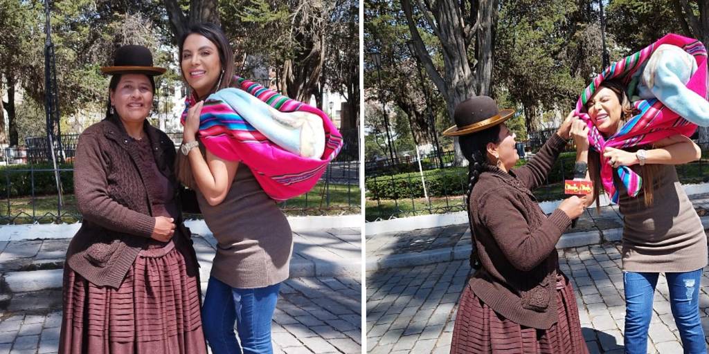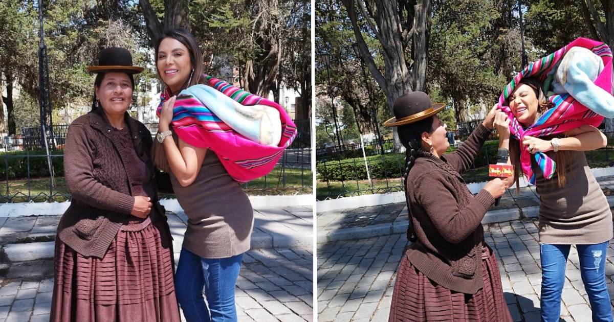 La Warmi Rosa, una creadora de contenidos en redes sociales, le enseñó a Sandra Alcázar, presentadora de Unitel, a cargar a un bebé en aguayo. De esta forma estaba preparando en actividades cotidianas a la presentadora para cuando nazca su bebé.