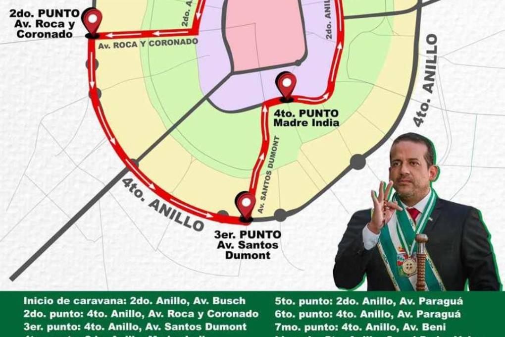 Después, a las 16:00, partirá una caravana desde la avenida Busch y segundo anillo y se avanzará por esta vía hacia la avenida Roca y Coronado para luego emprender rumbo al cuarto anillo de la avenida Roca y Coronado siguiendo esa ruta hacia la avenida Santos Dumont.